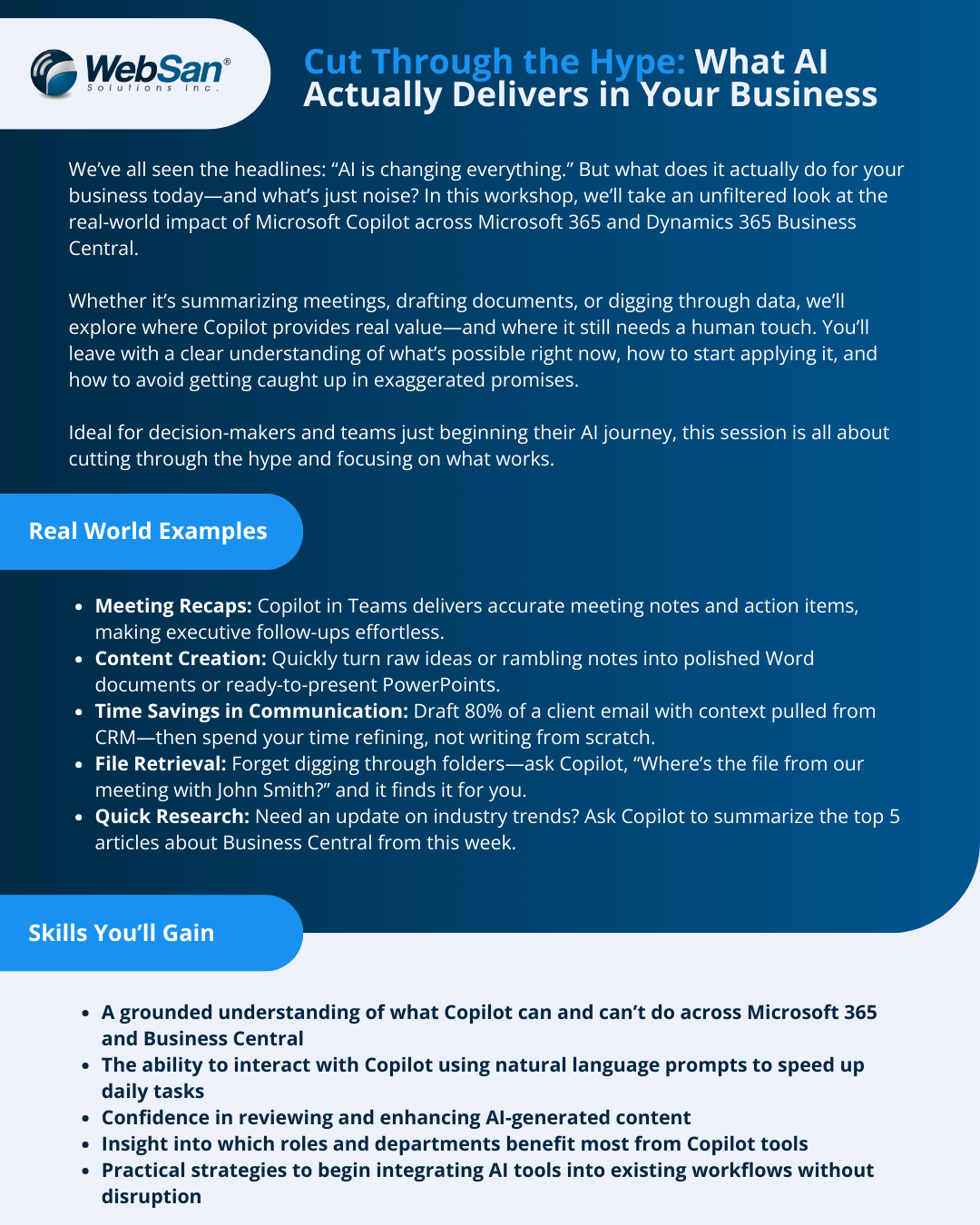 AI is everywhere—but what does it really do for your business? This session takes a no-nonsense look at how Microsoft Copilot enhances productivity in Microsoft 365 and Dynamics 365 Business Central. From meeting recaps to instant file retrieval, discover where AI delivers value today, where human oversight is still essential, and how to integrate it into your daily operations.