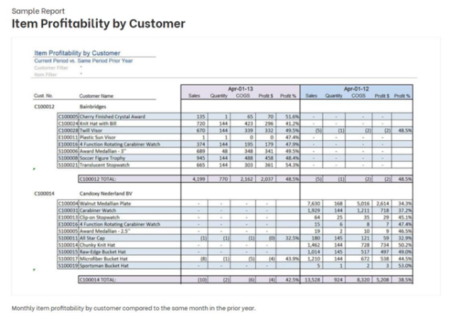 5. Item Profitability by Customer: This report allows users to analyze profitability by product, providing a breakdown of gross margin for different customers and products. With robust filtering capabilities and drill-down options to the originating data, this report is valuable for analyzing profitability on both an item and customer level.